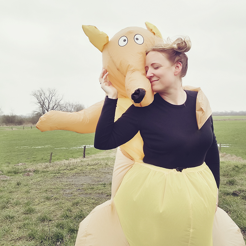 „Los, lass uns Spaziergänger erschrecken!“, schlug Vieke vor und waberte mit ihrem Dino-Kostüm über das nasse Gras. Der Gegenwind knickte ihren übergroßen Kopf nach hinten ab und ich konnte mich kaum halten vor Lachen. Mein Kostüm war praktischer, denn ich steckte wie ein Känguru-Baby nur mit den Beinen im Beutel des Kostüms. Mein Oberkörper guckte heraus und ich hatte perfekte Sicht auf das Spektakel.