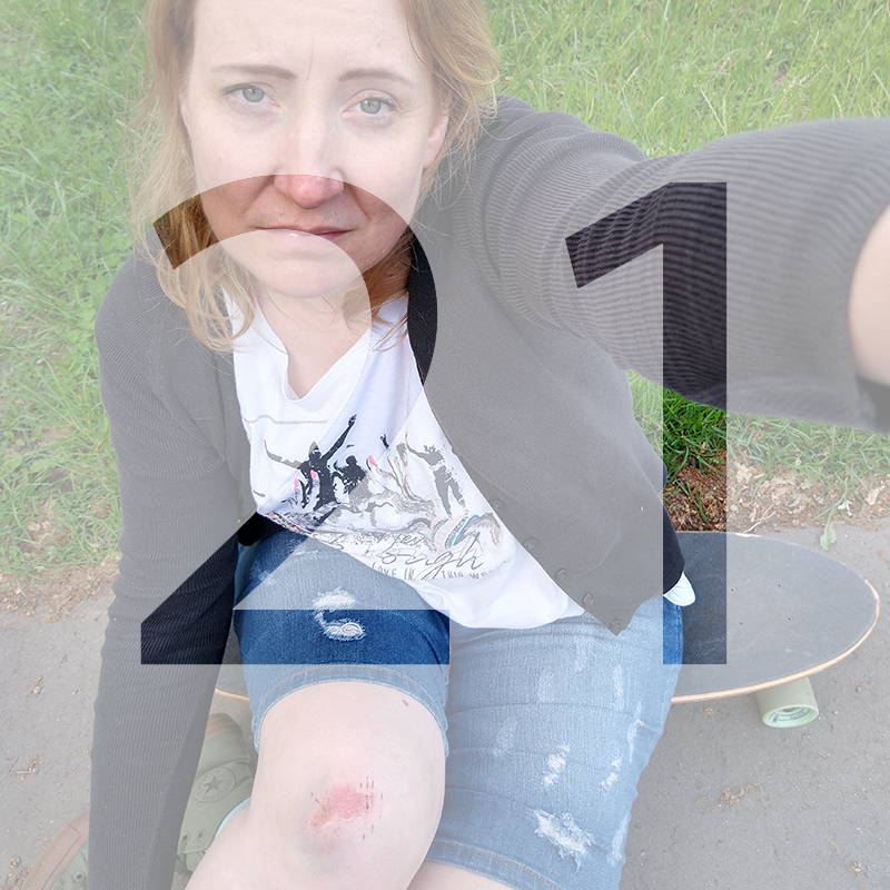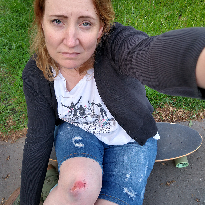 „Kann ich kurz ein Selfie mit deinem Handy machen?“, fragte ich Dima. Er reichte mir sein Telefon und ich humpelte zu meinem Skateboard, das sich im hohen Gras am Weg verfangen hatte. Ich setzte mich umständlich darauf und drückte ab.